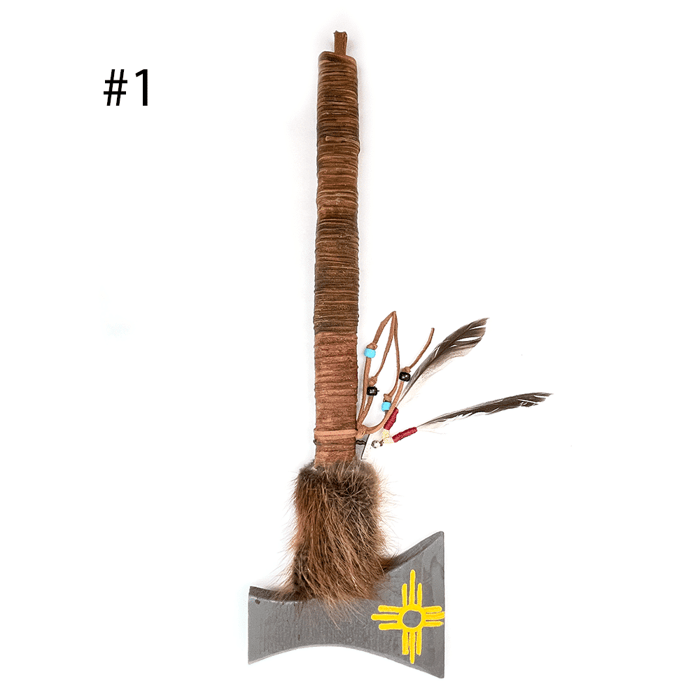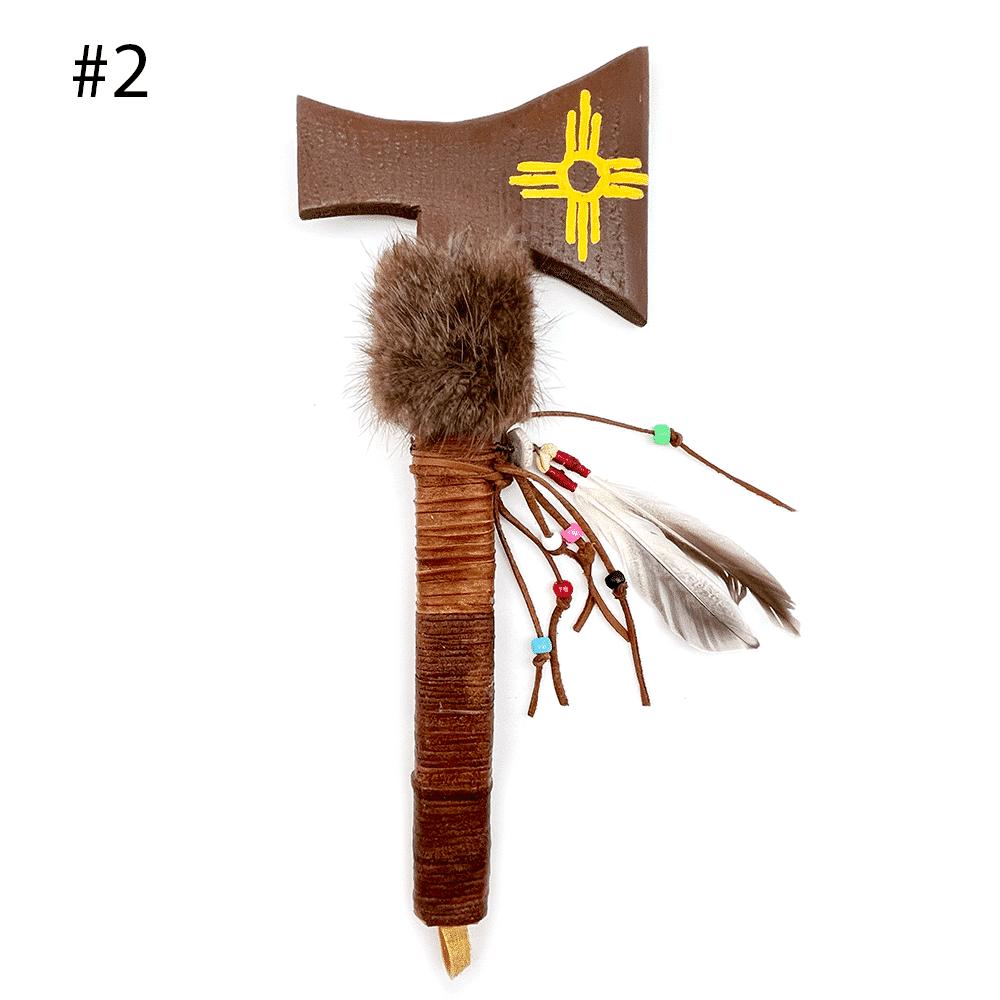 This painted tomahawk is made out of wood and has fur, leather wrapping and two faux feathers dangling. It measures approximately 15″ to 18″ long by 5 1/2″ wide and it is 1 3/4″ thick at fur. It is Navajo hand made by Tina Largo. Available in gray or brown for blade. Choose color when ordering. All are painted with the Zia design.