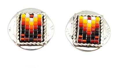 These round stamped sterling silver 5 row beaded earrings measure approximately 5/8″ in diameter. They are crafted by Navajo artisan Geraldrita Whitethorne. Colors and patterns will vary.