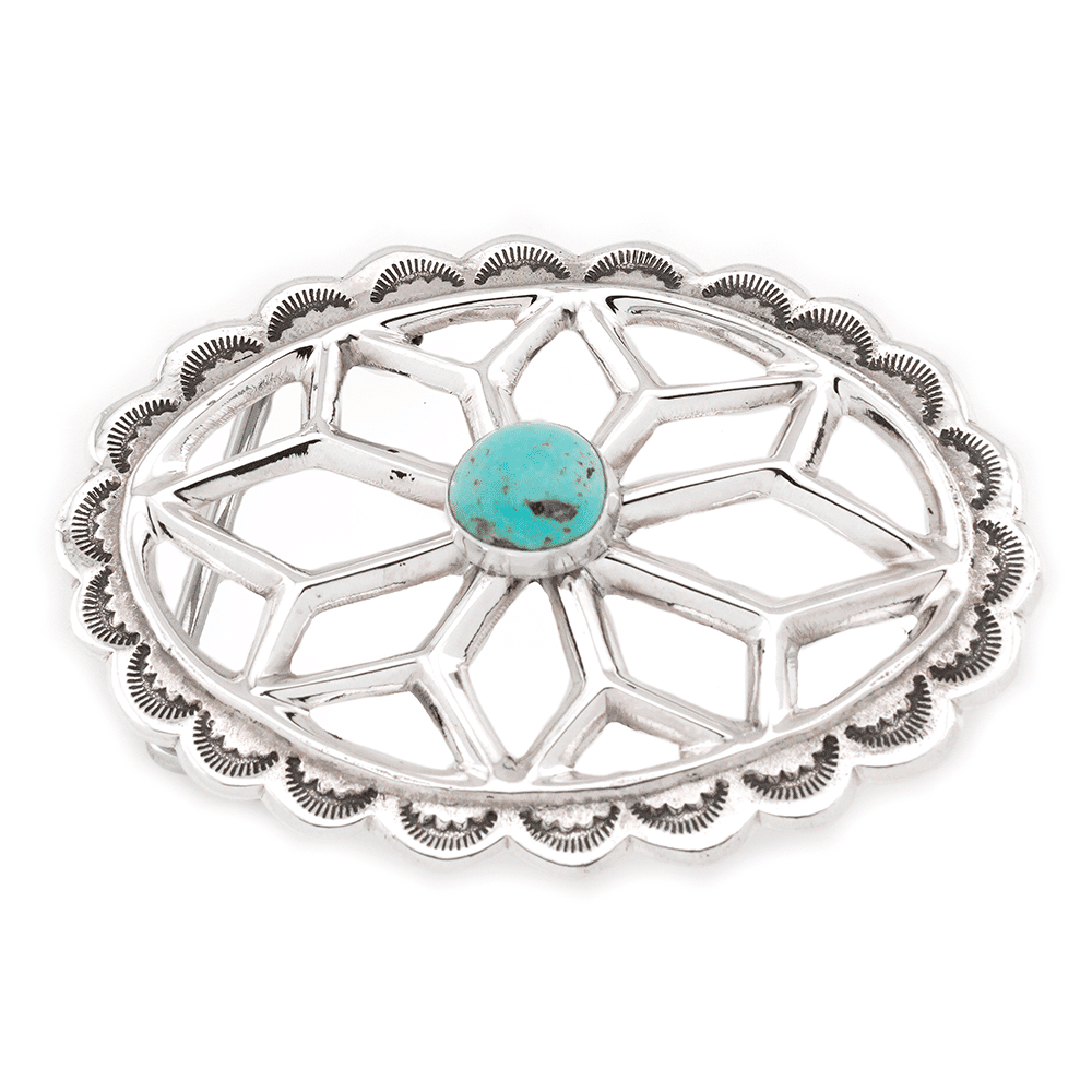 Sterling silver sand cast, open, belt buckle with a free form turquoise stone set in the center. It measures approximately 3 1/4″ long by 2 3/8″ wide. It is Navajo hand crafted by Harrison Yazzie. It has an 1 1/2″ buckle back. Only this one available.