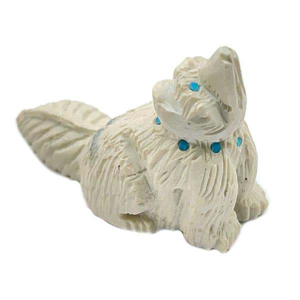 This sitting wolf is carved out of white serpentine and has turquoise dots inlaid around its neck and eyes and has its tail down. It measures 1 3/4″ long, 1 1/8″ tall by 3/4″ thick. It is Zuni hand carved by Adrian Cachini. Only this one available.
