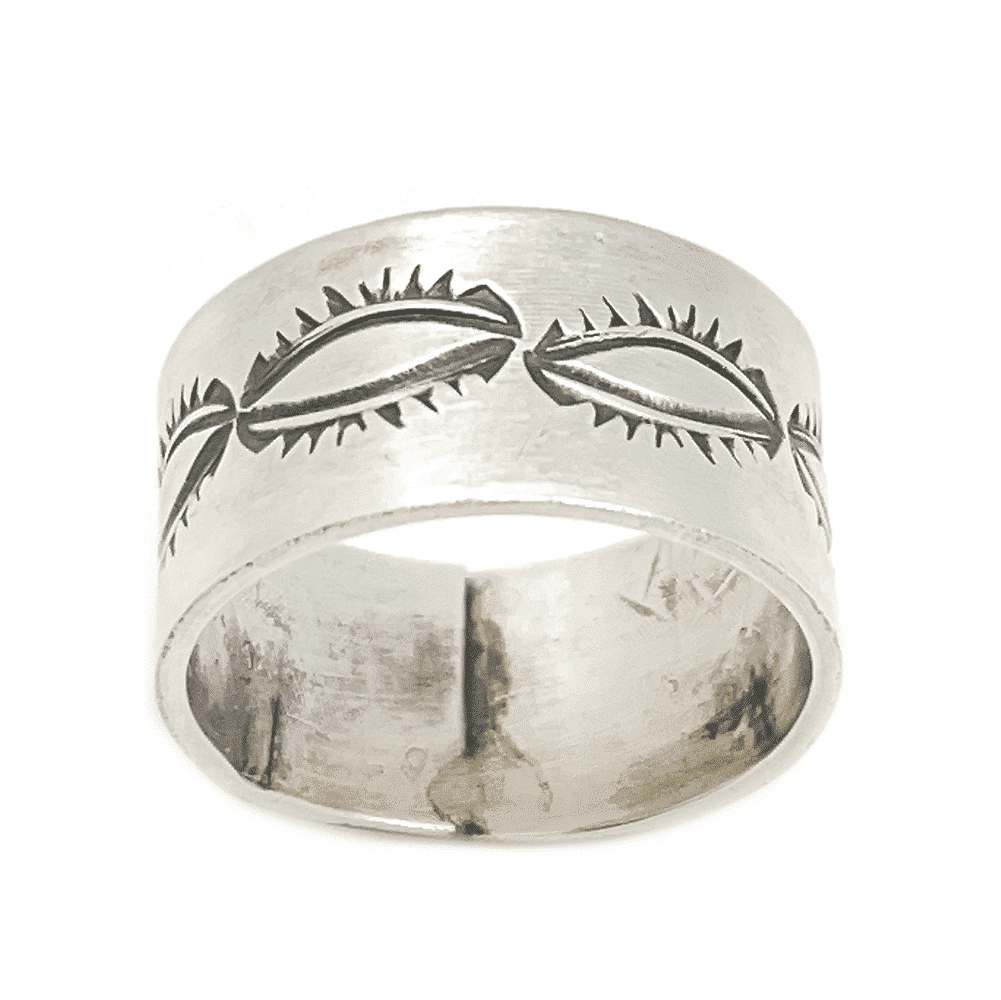 This sterling silver band has assorted stamping with a satin finish and measures approximately 3/8″ wide. It is Navajo hand made by Gary Sandoval. Stamping will vary. Available in sizes 6 1/2, 7 or 7 1/2. Choose size when ordering.
