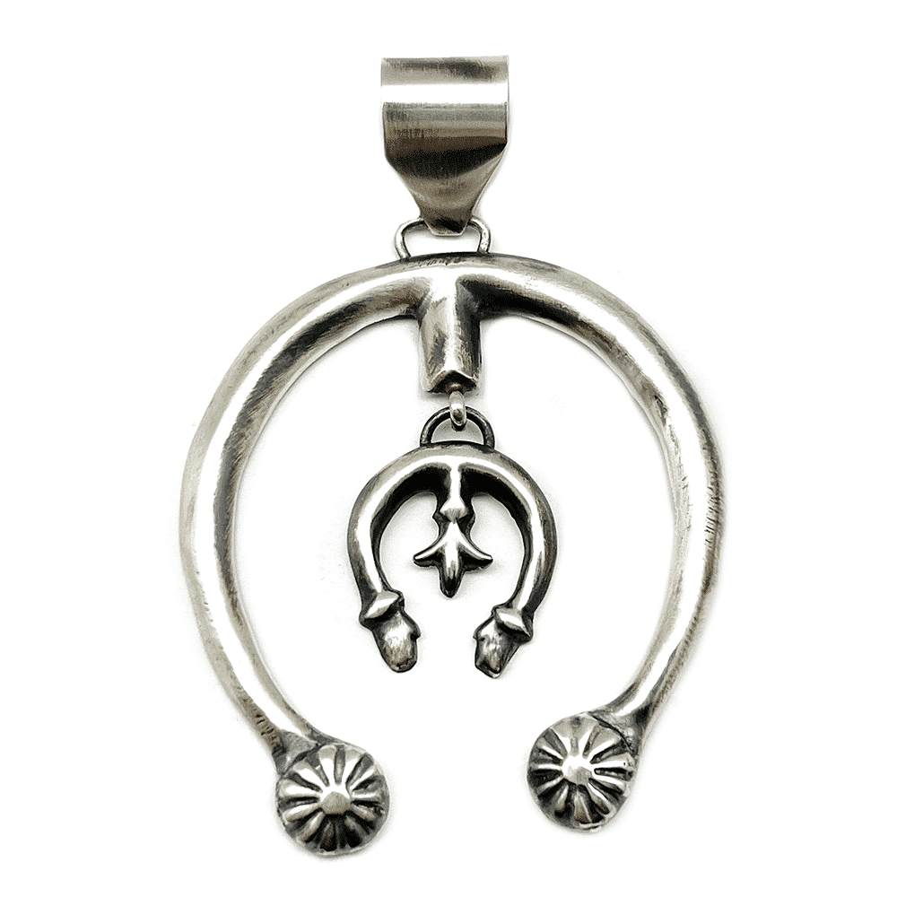 Sterling silver satin finished cast naja pendant with a small cast naja dangle. It measures approximately 1 7/8″ long includiong bail (3/8″ opening) by 1 3/4″ wide. It is Navajo hand crafted by Pauline Nelson.