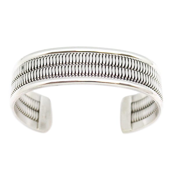 Sterling silver, good weight, bracelet with a double row of twisted wire slightly flattend and plain half round wire border. It measures approximately 3/4″ wide. It is Navajo hand made by Franklin and or Verna Tahe. 5 1/4″ wrist size wirh a 1 1/4″ opening. Original price was $491.00
