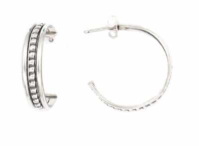 Sterling small silver hoop earrings that has beaded wire in the center.  It measures approximately 3/16″ wide with a 1/2″ hoop diameter. It is Navajo handmade by Caroline Tsosie.