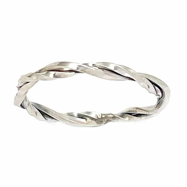 Sterling silver band is double square plain and twist. It measures a little over 1/16″ wide. Hand made by Navajo artist Caroline Tsosie. Available in sizes 5, or 5 1/2. Choose size when ordering.