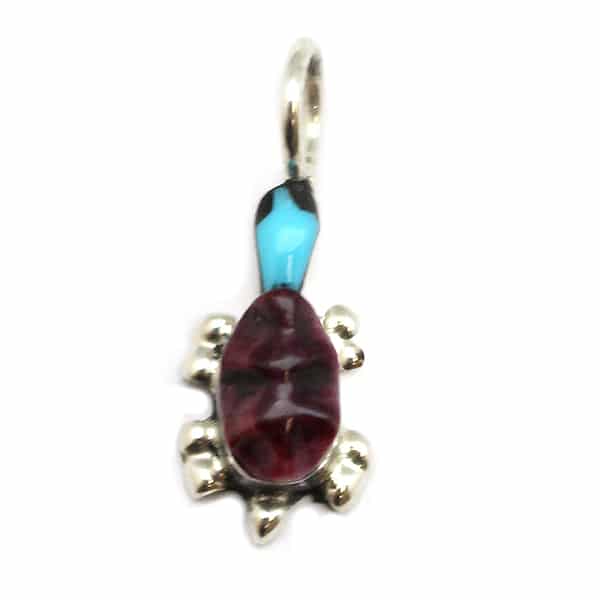 Pictured is a Zuni sterling silver inlay turtle pendant with turquoise head and purple spiny oyster body.  It measures approximately 3/4″ long including bail (just over 1/8″ opening) by 1/4″ wide.  It is Zuni hand made and inlaid by Lenette Chuyate.  Each batch comes in assorted body colors and smooth or carved backs.  Currently available with all in turquoise head with abalone, red spiny oyster, orange spiny oyster, mother of pearl or cowry shell carved body. Also available in malachite, cowry shell or mother of pearl in smooth back.  Choose style and color when ordering or let us choose for you.