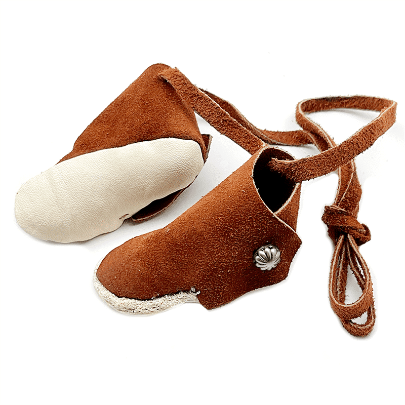 These small moccasins with one plastic concho button are hanging from a leather tie strap. The moccasins measure approximately 2 1/2″ long by just over 1″ wide and tie strap is approximately 4 1/2″ long and tied. They are Navajo hand crafted by Leo Benally. Size and soles may vary a little. ***Now concho on side varies in shape and has a turquoise color seed bead.***