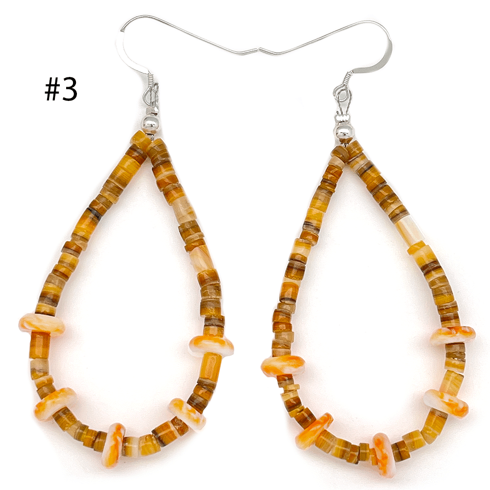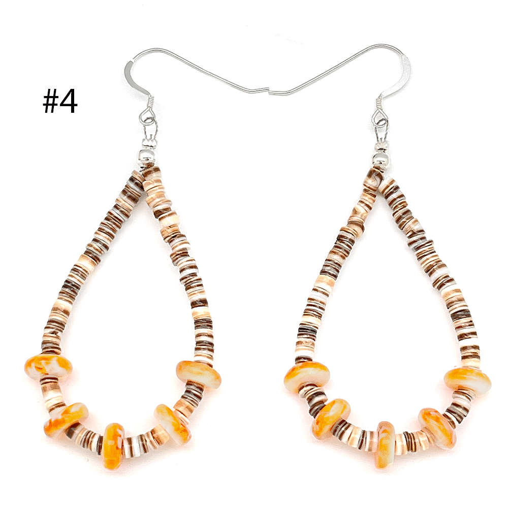 These loop earrings are made with 5 orange spiny oyster rondells and heishi. They measures approximately 3″ long including sterling silver french wires by 1 1/4″ wide. They are Navajo hand crafted by Naomi Garcia. Color of heishi vary on each style. **Now only available in #2.