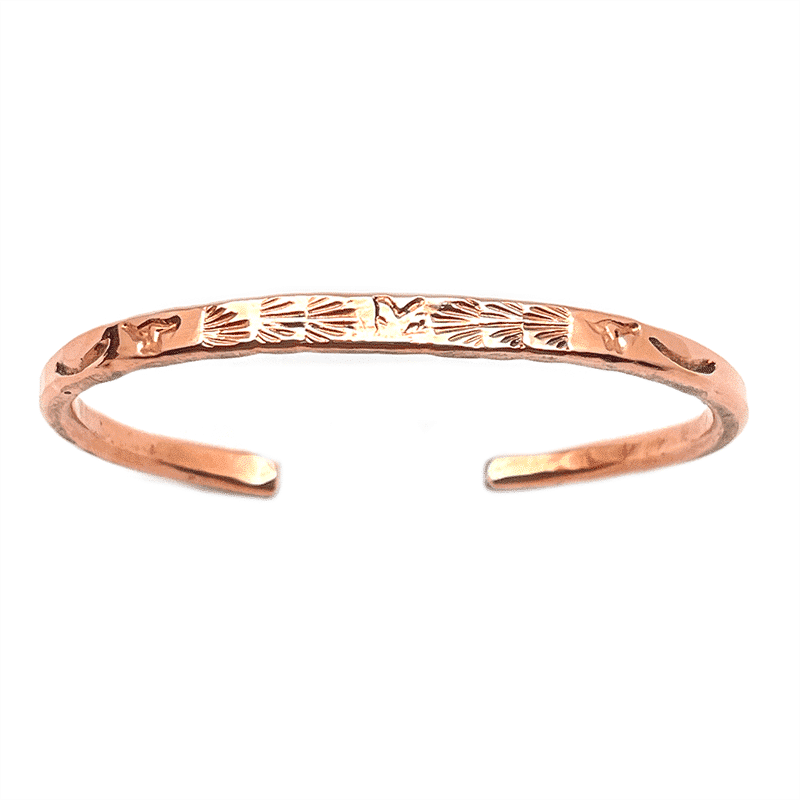 This copper bracelet is made with #6 round wire that is flattened a little and stamped on the top. It measures approximately 3/16″ wide at top. It is Navajo hand made by Shirley Brown. Wrist size measures 6″ with a 1″ opening. Stamping designs will vary with assorted animals and native designs. Available in flying birds, bears,, buffalo, howling wolf or paws. Choose a preference or let us choose for you.