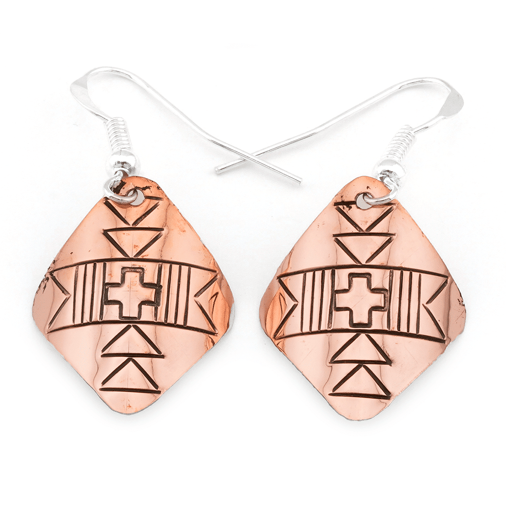 This copper earring is shaped in a curved square with assorted stamping. It measures approximately 1 3/8″ long including silver plated french wires by just under 3/4″ wide. It is Navajo hand made and crafted by Felicia Etcitty. Stamping designs will vary, you may not get the stamping that is pictured.