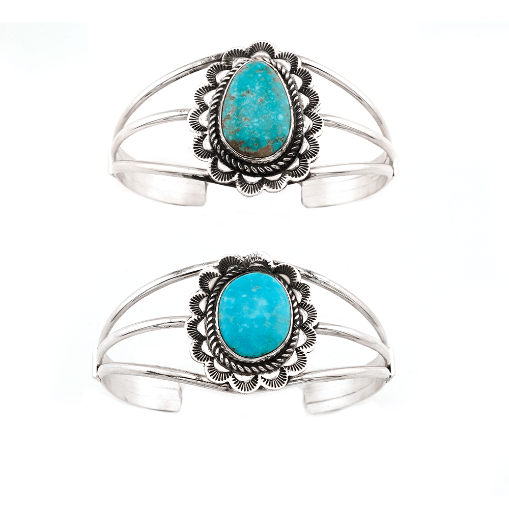 Sterling silver Kingman turquoise bracelet set in plain bezel with twist wire and stamp scalloped border all on a 3 wire shank. Top measures approximately 1 1/4″ to 1 3/8″ long by just over 1″ wide. It is Navajo hand made by Junior Begay. Shade of turquoise will vary in blue or green and will vary in amount of matrix as well. Choose color of turquoise when ordering. Shapes of stones will vary as well.