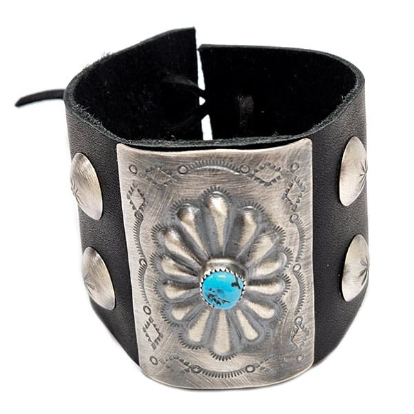 Sterling silver, rectangle concho with a free form turquoise in the center and 2 stamped buttons on each side all done in oxidized and satin finish. Center concho measures just over 2″ by 1 3/8″. It is Navajo hand made and crafted by Dale Morgan. Leather will taper down to 1 3/8″ at the ends. Leather is about 7 3/4″ – 8″ long and has leather ties. Stamping designs will vary.