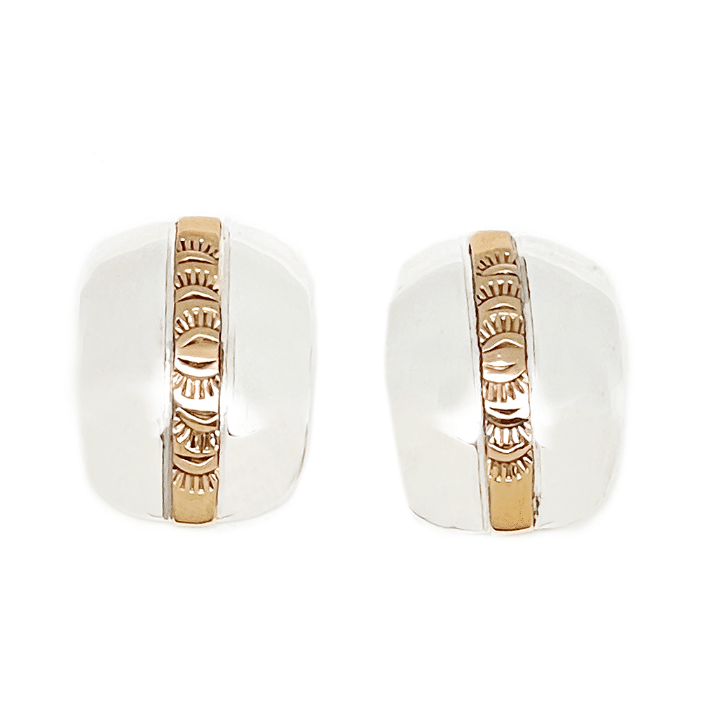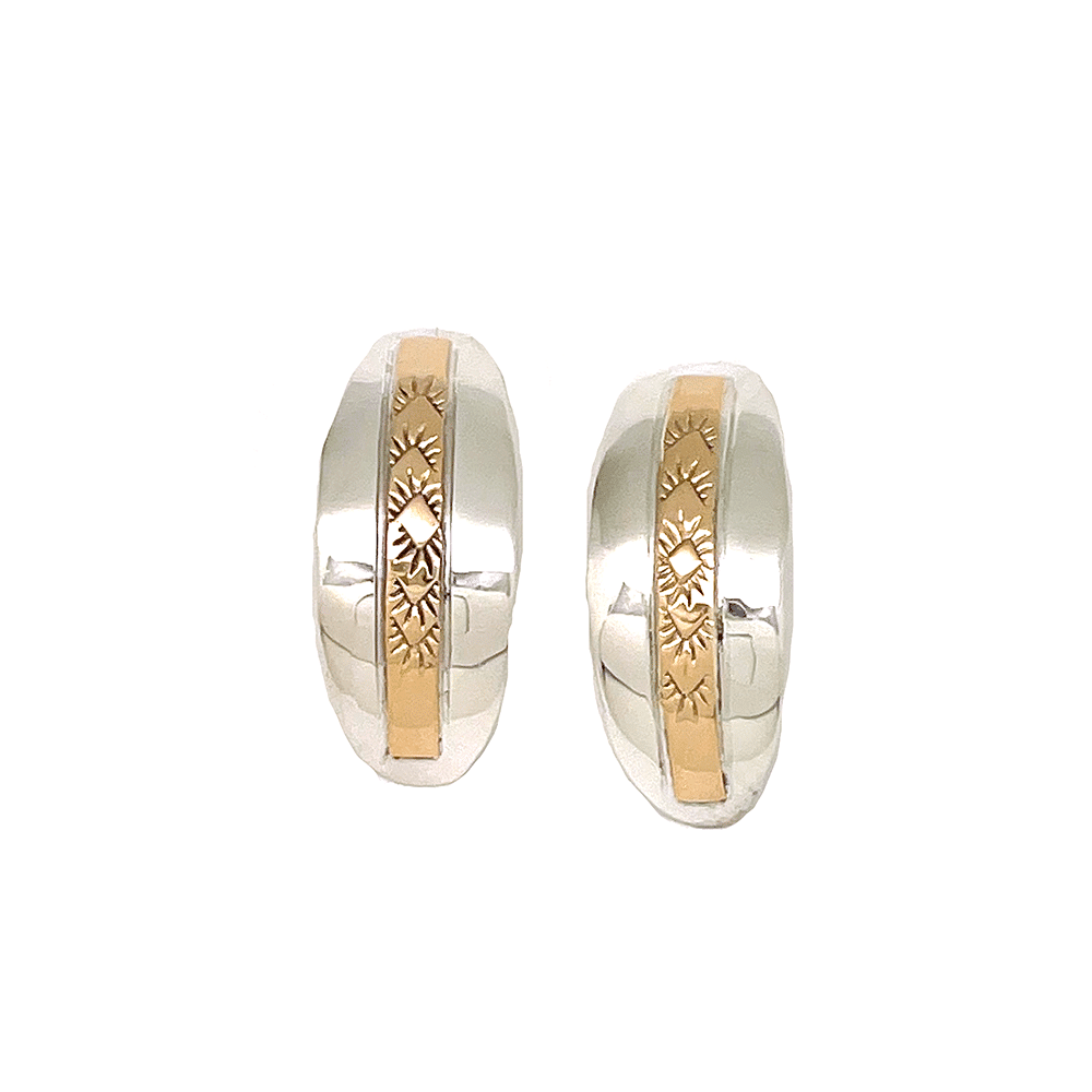This sterling silver teardrop earring has a strip of 14kt gold filled with stamping in the center. This earring measures approximately 3/4″ long by 5/8″ wide at widest point. It is Navajo hand made by Juanita Pinto. Stamping will vary. Also available in rectangle with rounded edges or narrow curve. Choose shape when ordering.