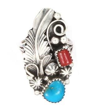 Sterling silver ladies ring with a free form turquoise and a free form coral stone and 1 large leaf, curly q’s and drops. It measures approximately 1 1/2” long by 3/4” wide at its widest point. It is handmade by Navajo artisan Rita Montoya. Leaf placement and size and shape of stones will vary. Only available in size 7.
