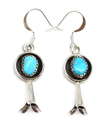 Sterling silver free form turquoise stone set in a plain wire oxidized circle with a blossom. It measures approximately 1 5/8″ long including the silver plated french wire by 7/16″ wide. It is made by Phil and or Lenora Garcia. Stone will vary in shape, size and color shade.