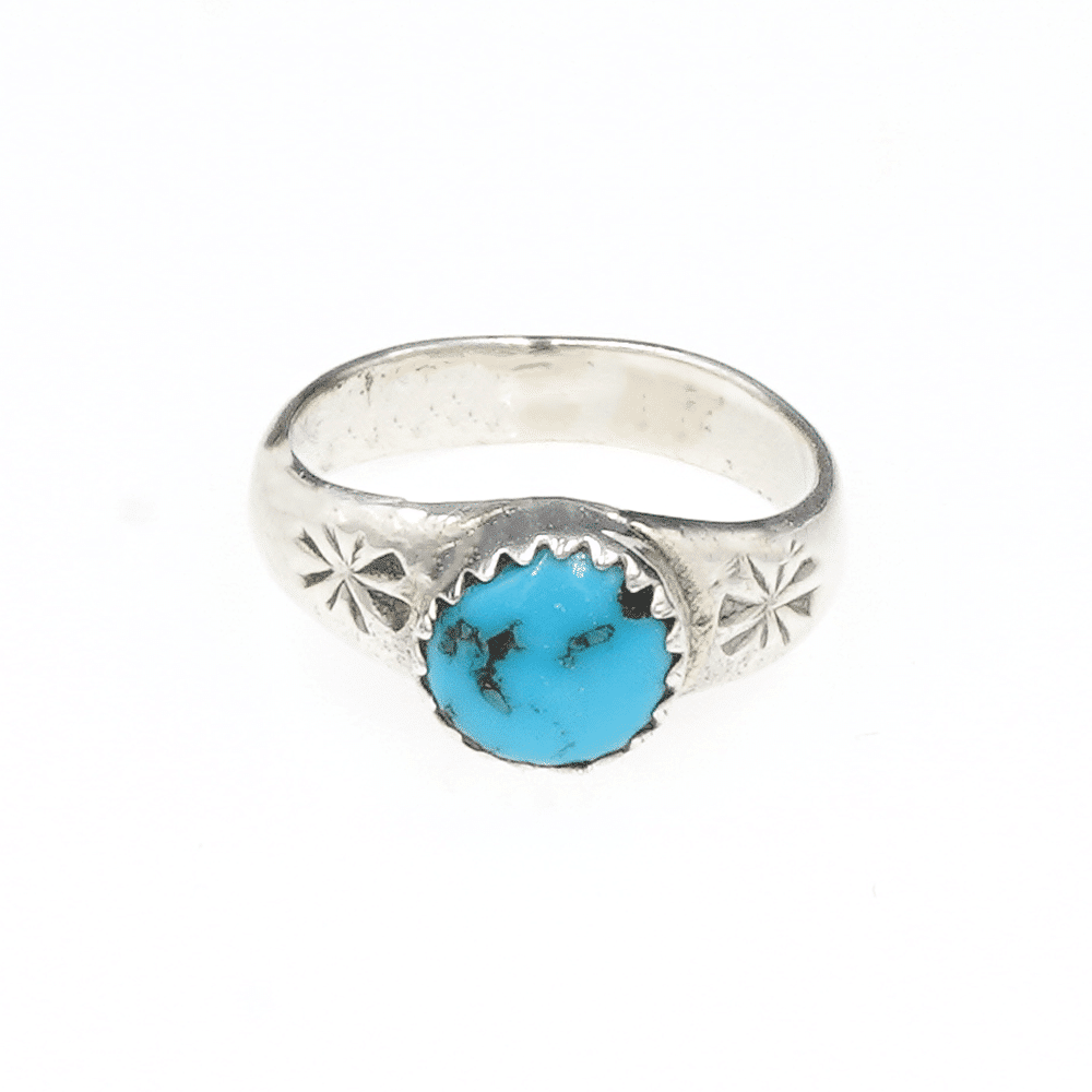 Sterling silver sand cast shank ring with a free form Kingman turquoise stone. It measures approximately 1/4″ wide in the center and tapers down. It is Navajo hand crafted by Pauline Nelson. Size,shape and color shade of stone will vary. Stamping on the sides will vary. Available in size 8, 8 1/2 or 9 1/2. Choose size when ordering. Available in light blues or light green shades.