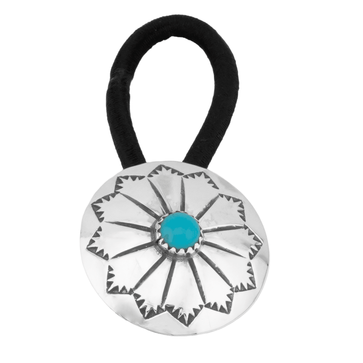 Sterling silver stamped concho stretch hair tie with a 6mm stabilized turquoise stone. Concho measures approximately 1 1/8″ in diameter. It is Navajo handmade and crafted by Phil Lynn. Turquoise color shade will vary in light and dark blues with some having a little bit of matrix.