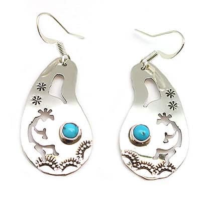 Sterling silver paint pallet shape cutout earring with a round dot turquoise stone and stamping. It measures approximately 1 3/4″ long including silver plated french wires by just under 3/4″ wide at widest part. It is Navajo hand crafted by Jeff James Jr. Cutouts available are feather, storyteller or bear paw. Choose design when ordering. Stamping designs may vary.