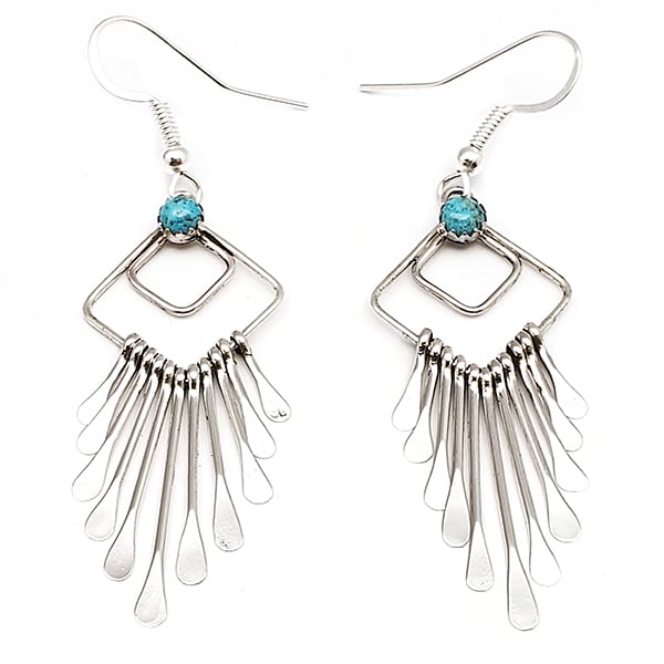 Sterling silver earring with two squares made of wire, 1 dot of turquoise and 10 wire paddle dangles. It measures approximately 2 3/8″ long with silver plated fench wires by 3/4″ wide. It is Navajo hand made and crafted by Delmar Armstong. Color shade of turquoise may vary.