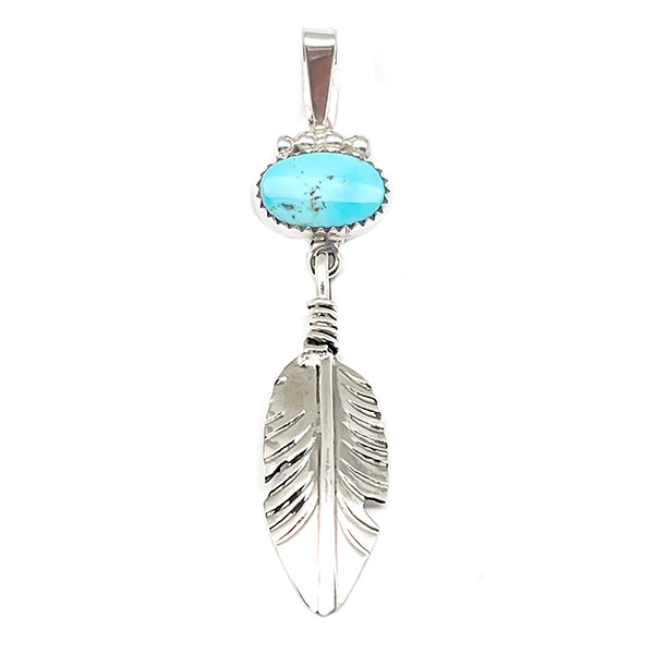 Sterling silver handmade pendant with a free form turquoise stone (laying more horizontal) and all handmade stamped silver feather. It measures approximately 2 1/2″ long including bail (3/16″ opening). Feather measures 1/2″ wide at widest. Navajo handmade by Alice Johnson. Turquoise stone will vary in shape, size and color. Choose light or dark blue shades when ordering, some with heavy matrix.