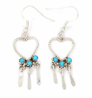 These sterling silver earrings have a twist wire that is made in the shape of a heart with 3 turquoise dot stones and 3 silver paddles. They measure approximately 2″ long including silver plated french wire and are just over 1/2″ wide at its widest point. Handmade by Navajo artisan Michael Bitsie.