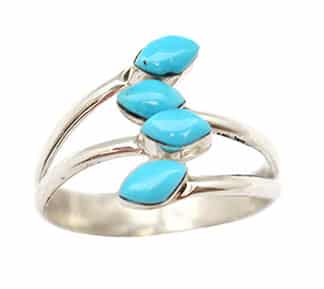 This sterling silver ring has a split shank and on each end is a small hand cut and inlaid football shape Kingman turquoise stones and are interlocked and slightly adjustable. Top measures just over 1/2″ long and each stone is about 1/4″ wide. It is Zuni hand made by Charlotte Natewa. Available in size range of 5 1/2.