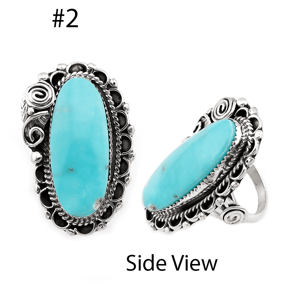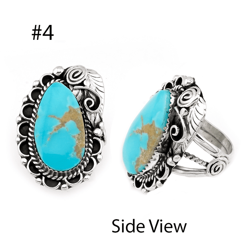 Sterling silver ladies ring with an assorted shape natural White Water turquise stone set in a sawtooth bezel with twist wire & scalloped border with a leaf & curly q’s on a split shank. Top measures approximately 1 3/8″ – 1 5/8″ by 1″ wide. They are Navajo hand made by Lorena Brown. Light brown matrix will vary. Choose style by number when ordering.