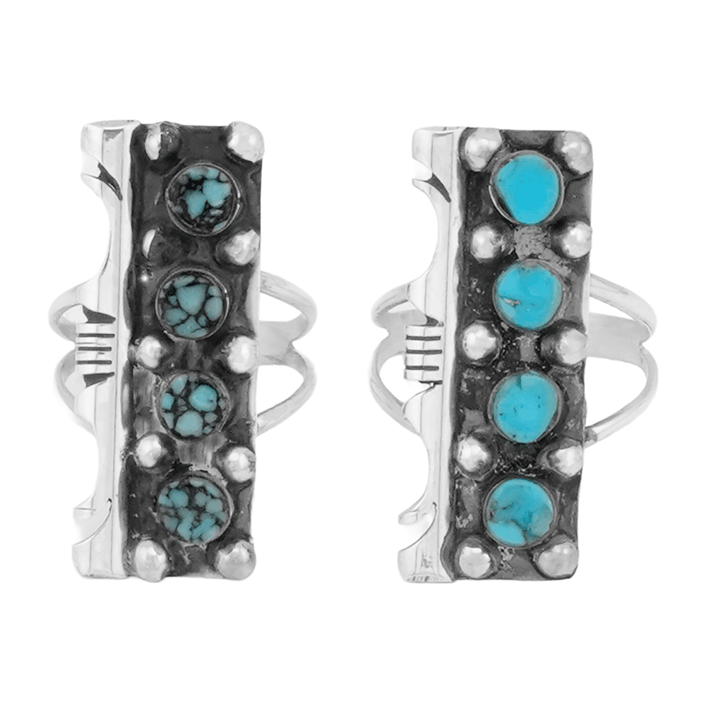 Sterling silver ladies ring with 4 inlay dots of assorted turquoise with one side fancy cut border on a double wire split shank. Top measures approximately 1 1/4″ long by 1/2″ wide. It is Navajo hand made and inlaid by Steve Francisco. Available in light blue shades with little matrix in size 7, 7 1/2, 8 or 9. Also available with heavy black matrix in size 7. Choose type of turquoise and size when ordering.