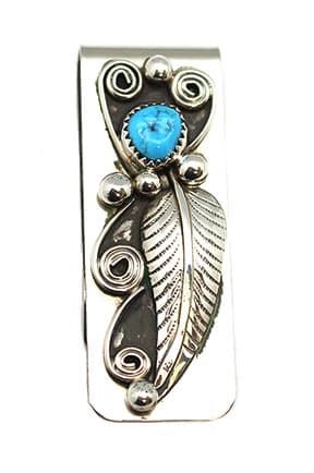 This base metal money clip has a sterling silver leaf, curly q’s and drops on top along with a free form turquoise stone. It measures just over 2″ long by 3/4″ wide. It is Navajo hand crafted by Elsie and Wilbur Myers. Stone will vary in shape, size and color shade and silver work may vary in placement.
