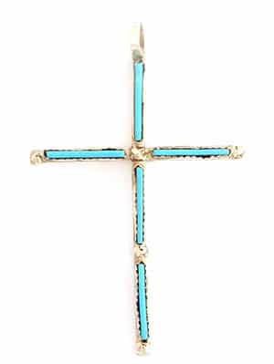 This sterling silver cross pendant has 4 synthetic turquoise needlepoint stones with silver drops. It measures approximately 1 3/4″ long including bail (1/8″ opening) by 1 1/8″ wide. It is Zuni handmade by Ashley Laate.