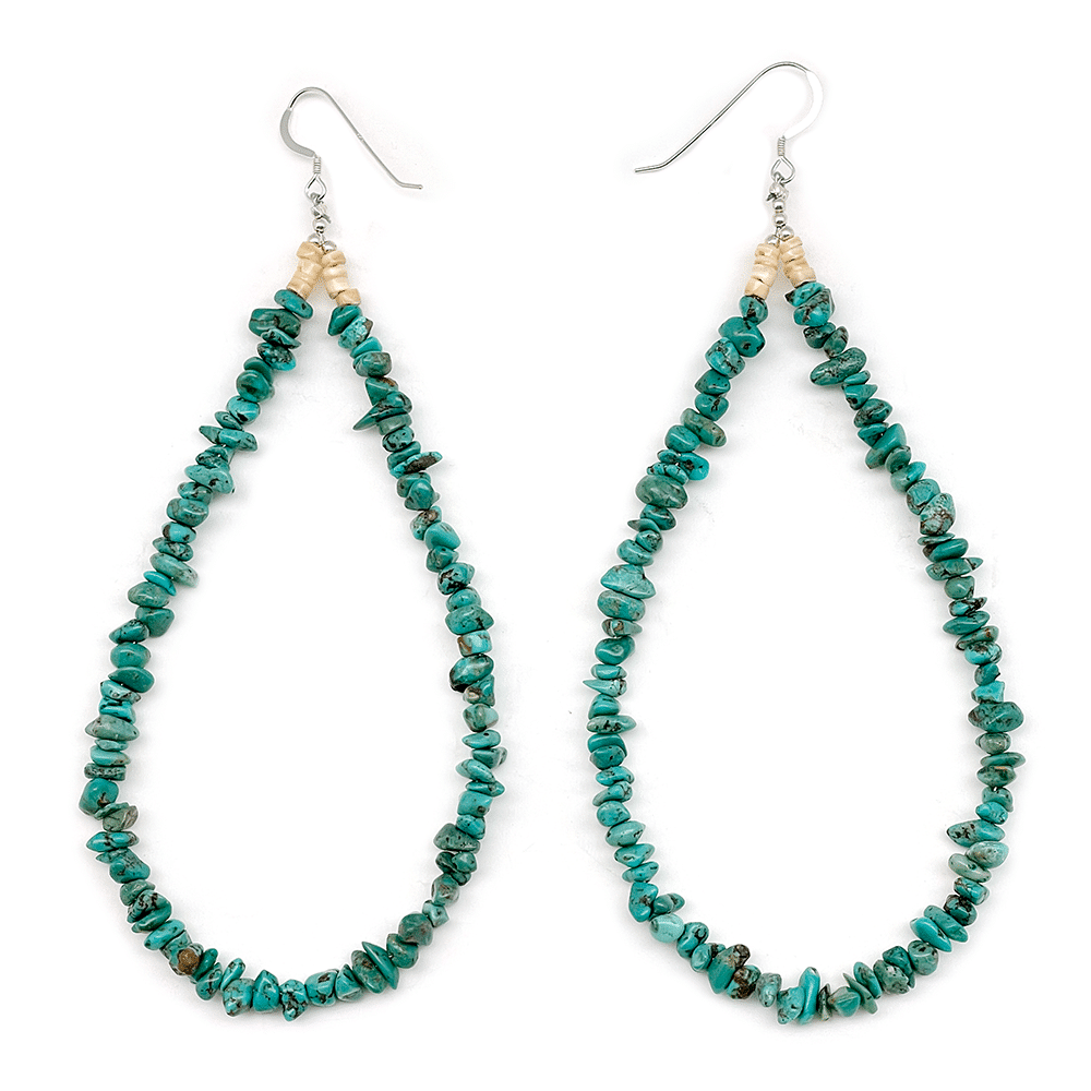 These earrings are handstrung turquoise nuggets and light shell heishi. It measures approximately 4 1/2″ long with silver plated french wires by 2″ wide loop. It is Navajo hand crafted by Timberly Tom. Lengths may vary a little.