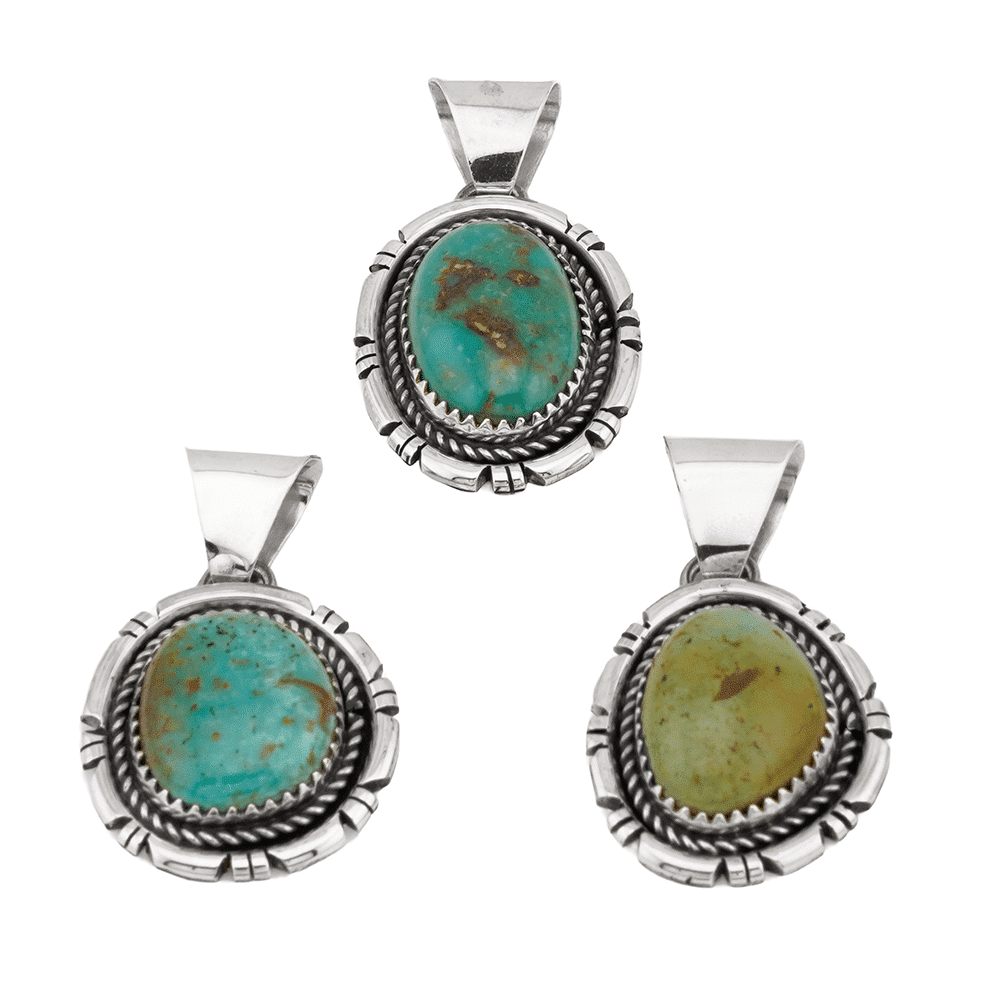 Sterling silver pendant with one free form Sonoran turquoise stone set in a sawtooth bezel with twist wire and cut borders. It measures approximately 1 3/8″ to 1 1/2″ long including bail (3/16″ opening) by 3/4″ to 7/8″ wide. It is Navajo hand made by Alice Johnson. Stone’s shape, color shades and size will vary. Mostly all in light and dark greens with some having more brown matrix than others. Choose light or dark shades.