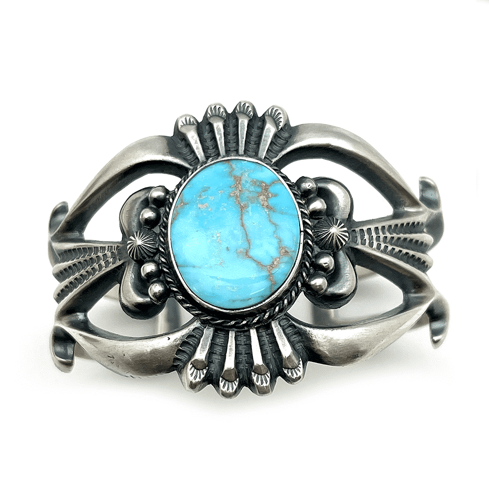 Sterling silver large sand cast bracelet with a oval natural turquoise stone. Center measures approximately 1 3/4″ wide and tapers down to 1/2″ wide. Wrist size is 5 3/4″ with a 1″ opening. It is Navajo hand crafted by Harrison Bitsue. It is done in an oxidized and satin finish. ***Currently available in Nevada blue turquoise shades with dark reddish brown matrix. ***None available in shape and color as pictured at this time.****