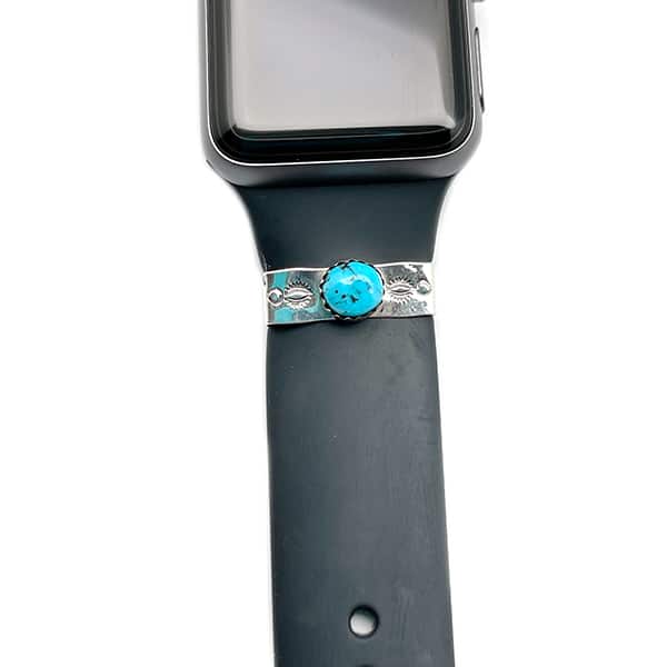 Sterling silver smart watch band (or other watch band) turquoise and stamped buckle. It measures approximately 3/4″ long, just over 1/4″ wide and just over 1/8″ tall opening. It is Navajo hand made by Johnny Watson. Turquoise will vary in shape and size some. Some may have more matrix than what is pictured. It has a split opening on the back to adjust slightly and pinch down tight to band. Stamping will vary as well. Only one can be worn or on both sides of watch. Sold as each and not in pairs.