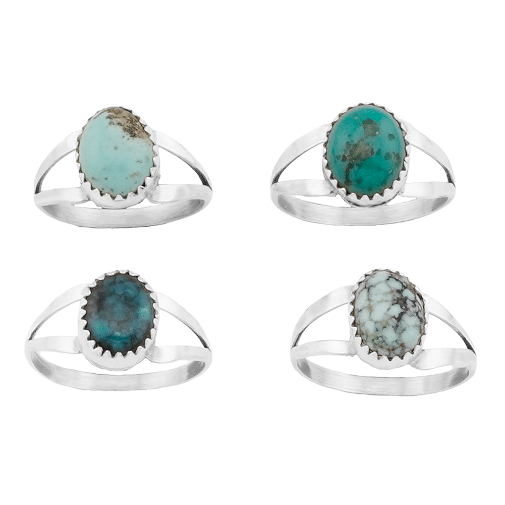 Sterling silver ladies ring with an oval 8X10mm turquoise stone set in bezel on a plain split shank. Top measures approximately 7/16″ long by 3/8″ wide. It is Navajo hand made by Robinson Martinez. Available in light Kingman in size 4, 6 1/2, 7, 7 1/2, 8 and dark Kingman in size 8 or light Chinese in size 8. Choose turquoise type and size when ordering. You may not get the color exactly as pictured.