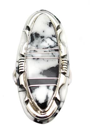 Synthetic white buffalo inlay ring set on sterling silver and on a double wire shank. It measures approximately 1 5/8″ long by just under 3/4″ wide. It is Navajo hand made and inlaid by Steve Francisco. Available and is a size 7 1/2, 8, 8 1/2, 9 or 9 1/2. Choose size when ordering. Amount of black and white on each will vary.