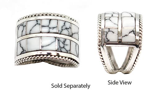 A double row of synthetic white buffalo inlay sections set in sterling silver and twist wire border edge all the way down the shank. Top measures approximately 1/2″ wide. It is Navajo hand made and inlaid by Bruce Johnson. ***Only available in size 6 1/2.*** Color shade of stone will vary.