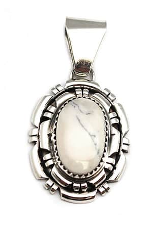This Navajo handmade sterling silver pendant has a free form white buffalo stone with a double 1/2 round cut wire border. It measures approximately 1 3/4″ long including bail by 7/8″ wide. Made by Harry Spencer. Size, shape and color shade of stone may vary. Currently available with some areas of black matrix and bright white.