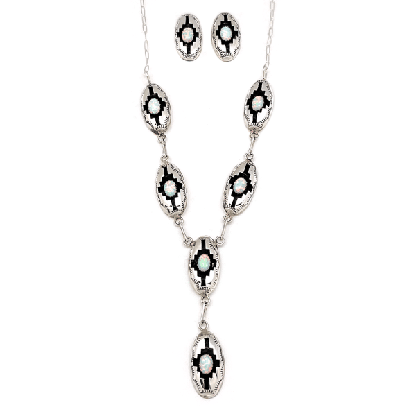 Sterling silver shadowbox (blessing pattern) necklace and earring set with 5X7mm white synthetic opal stones. Necklace measures approximately 18″ long and center double dangle measures 2 3/8″ long by 1/2″ wide. Earring measures just under 1″ long by 1/2″ wide. It is Navajo hand made and crafted by Felix Perry. Stamping around border may vary.