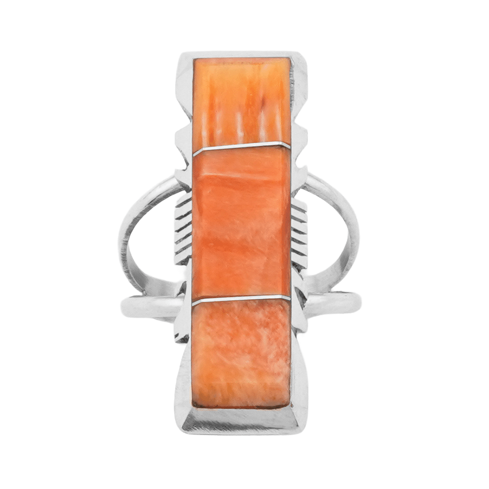 Sterling silver ladies ring inlaid with wild horse and silver dividers with a tri-wire cut border all on a double wire split shank. Top measures just under 1 1/2″ long by 1/2″ wide. It is Navajo hand made and inlaid by Brandon Etcitty. Available in size 11. Also available in orange spiny oyster in size 11. Choose color when ordering.