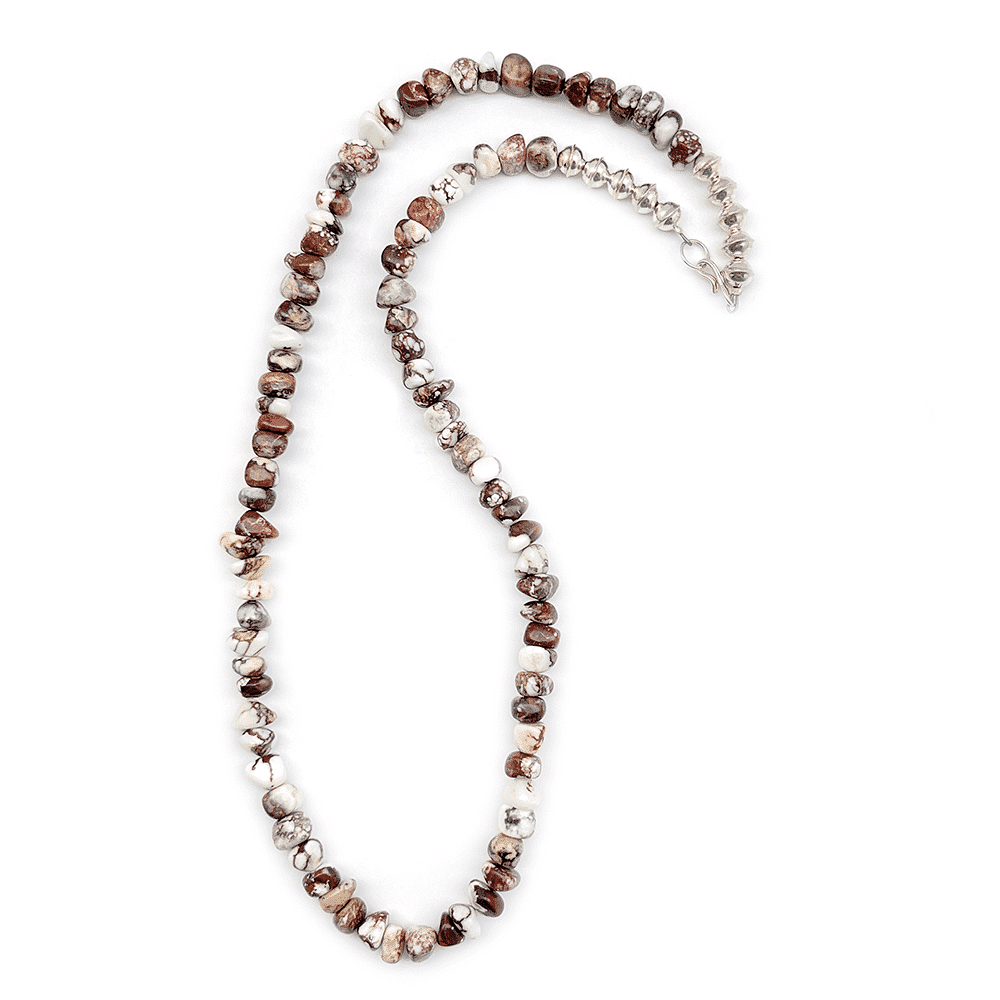 This necklace is made with wild horse nuggets and 7mm sterling seamed beads. It measures approximately 20″ long with sterling hook and eye by almost 3/8′ wide at widest nugget. It is Navajo hand crafted by Valarie Johnson.