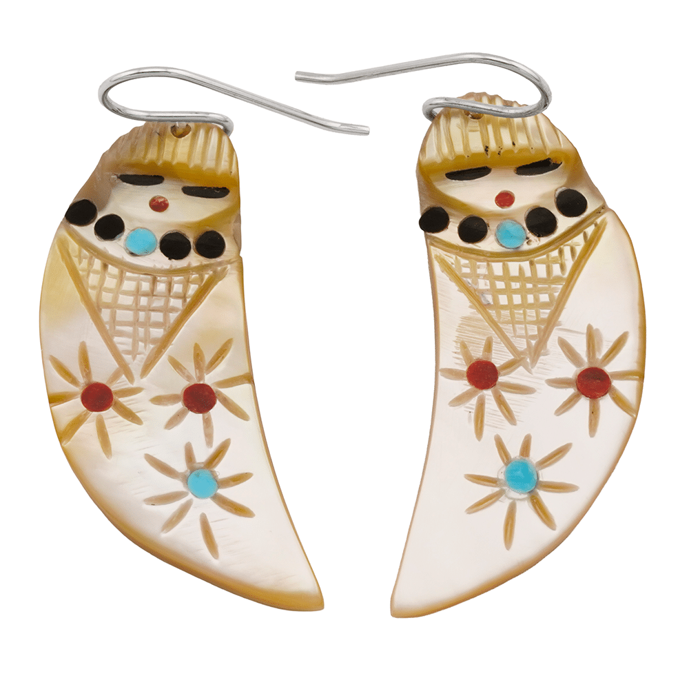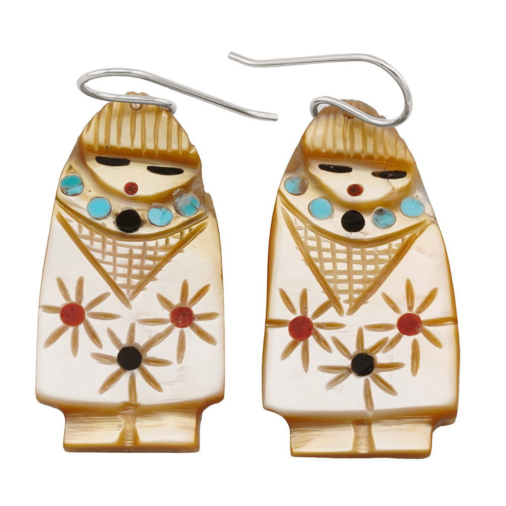 These Zuni maiden earrings are carved out of yellow shell and have inlaid black jet or pen shell, turquoise and coral or spiny oyster dots through out. It measure approximately 1 3/4″ long with sterling silver french wires by 3/4″ wide and 1/8″ thick. They are Zuni hand carved and inlaid by Cheryl Beyuka. Curved maiden measure approximately 2″ long with sterling french wires by 5/8″ wide. Choose style when ordering.