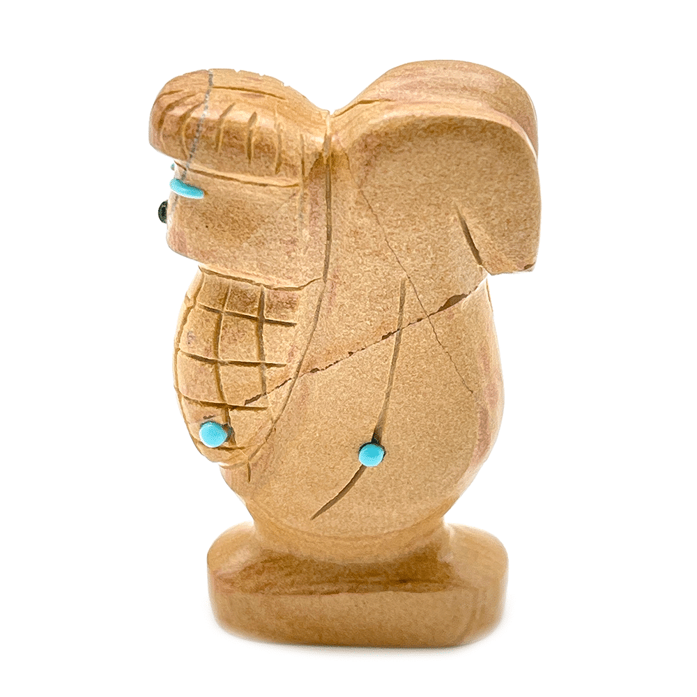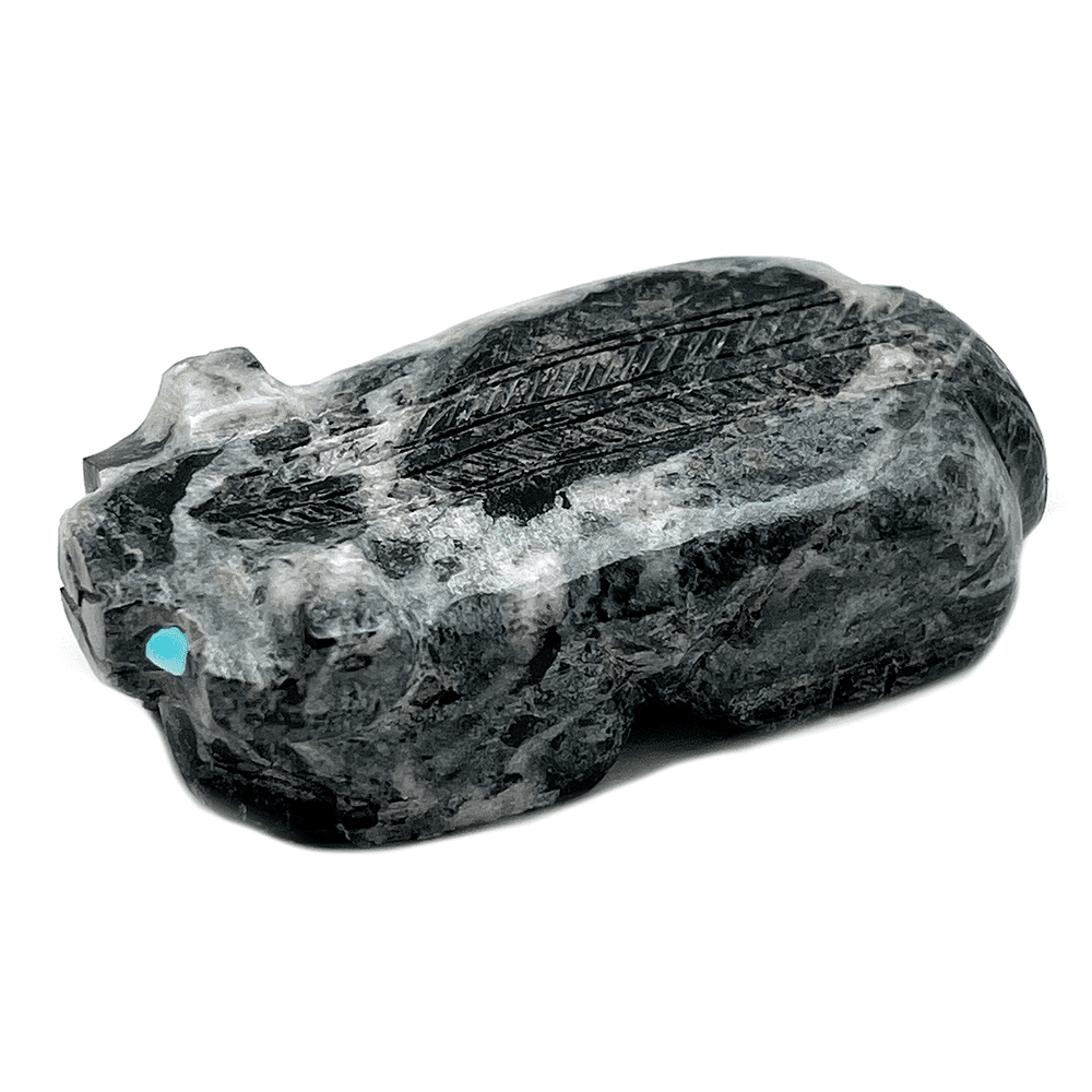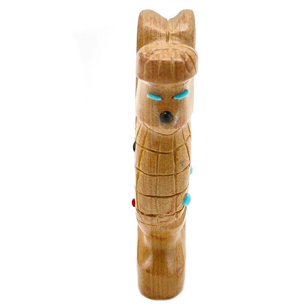 This corn maiden is hand carved out of picture jasper and has turquoise, jet and coral dots. It measurse just under 2 1/4″ tall by 1 1/4″ wide and just udner 1/2′ thick. It is Zuni hand carved by Cody Chavez. Also available is a badger carved out of black marble and it measures 1/2″ tall, 2 1/4″ long and 1 1/8″ wide. Choose animal when ordering.