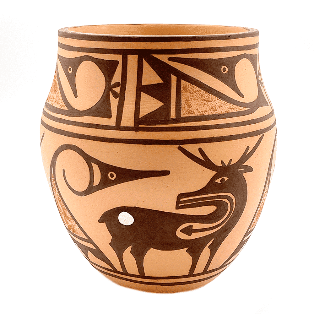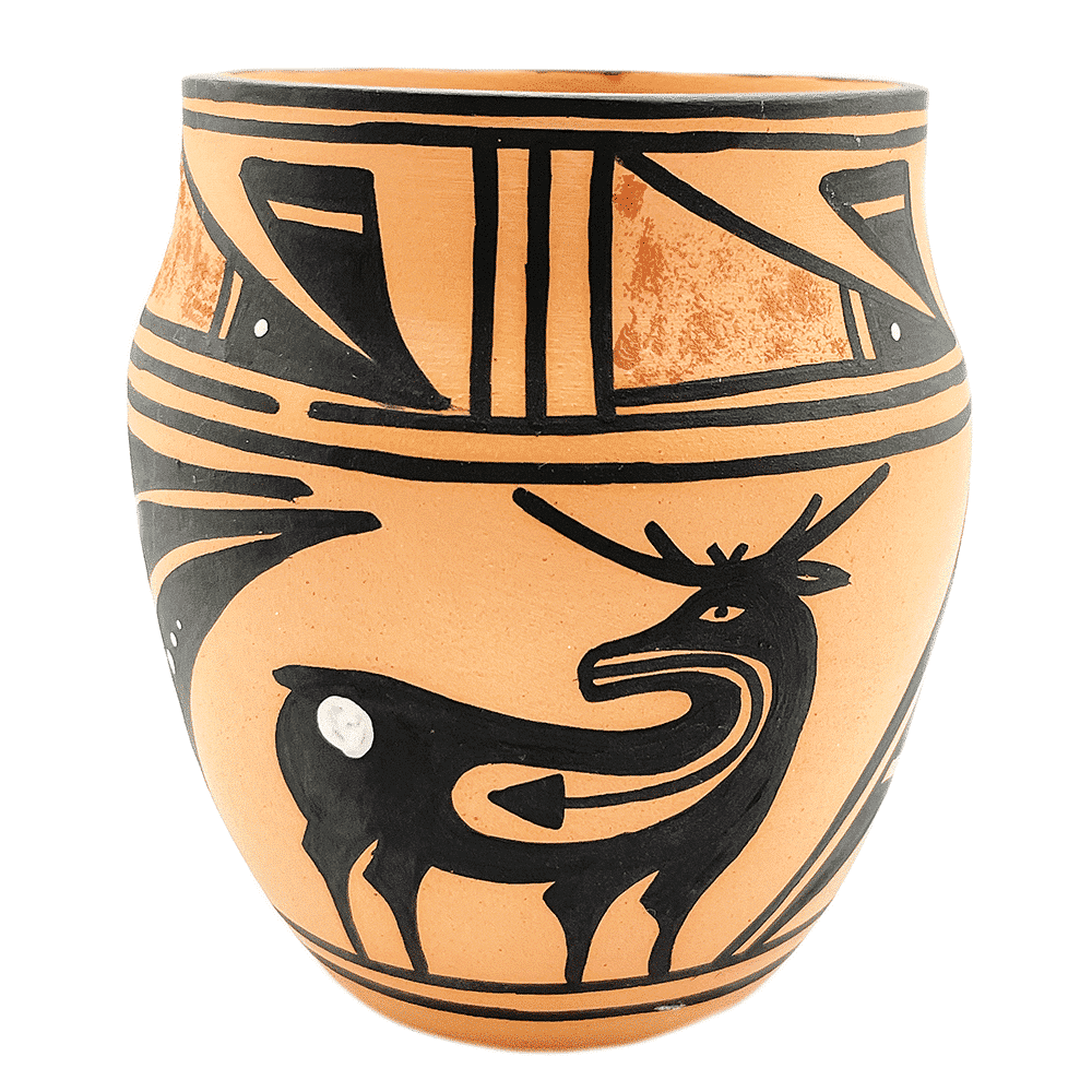 This water jar is handmade with red clay and painted with black handmade colors with a deer design and assorted patterns. It measures approximately 5 1/2″ tall by 4 3/4″ wide. It is Zuni handmade by Marjorie Katsenih. Also available in brown color design. Choose color when ordering. Original price was $235.00. Additional shipping charges will apply on this item for extra boxing.