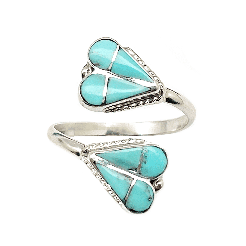 Sterling silver turquoise inlay adjustable woman’s ring.  Each piece has two tear drops inlaid with one silver divider and has a twist wire border.  Each heart shape piece measures approximately 1/2″ long by 3/8″ wide at widest point.  Zuni hand made and inlaid by R. Nastacio. Available in size 7, 7 1/2, 8, 9 & 10 range.  Choose size when ordering.