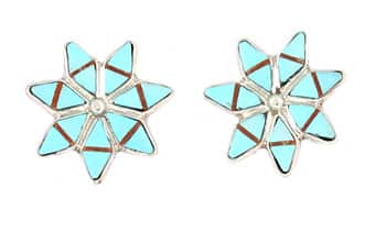 Sterling silver star shape post earrings, inlaid with turquoise and a strip of coral. They measure approximateley 5/8” in diameter. Handmade by Zuni artisan Francine Chapito.