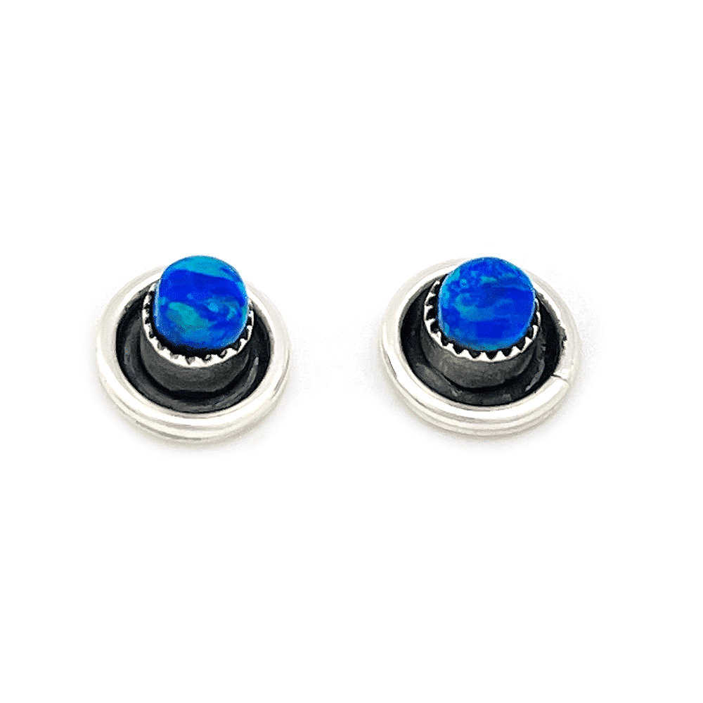 Sterling silver post earring made with a hand cut dark blue synthetic opal set high on a oxidized and plain wire border. It measures 3/8″ in diameter. It is Zuni hand made by Mary Tsadiasi. ***Now only available in white or red synthetic opal. Choose color when ordering. ***None in dark blue as pictured at this time.****