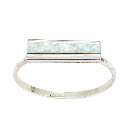 Sterling silver ladies ring with an inlay carved dash white synthetic opal and plain square wire side borders on a single wire shank. Top measures just over 1/8″ long by 1/2″ wide across. It is Zuni hand made and inlaid by Dentin Bobelu. Available in size 5, 6, 7 or 8. Choose size when ordering. Color shade of opal is white with red fire.