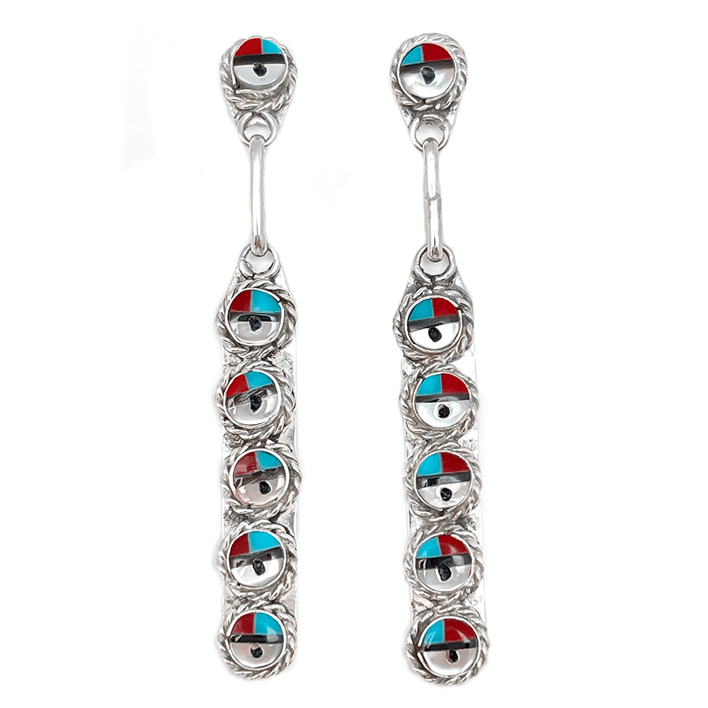 Sterling silver 6- sun-face post earrings with a twist wire border. It is inlaid in traditional colors of turquoise, coral, jet, mother of pearl. It measures approximately 2 1/4″ long by just over 1/4″ wide. It is Zuni hand made by Devoria Bowekaty.
